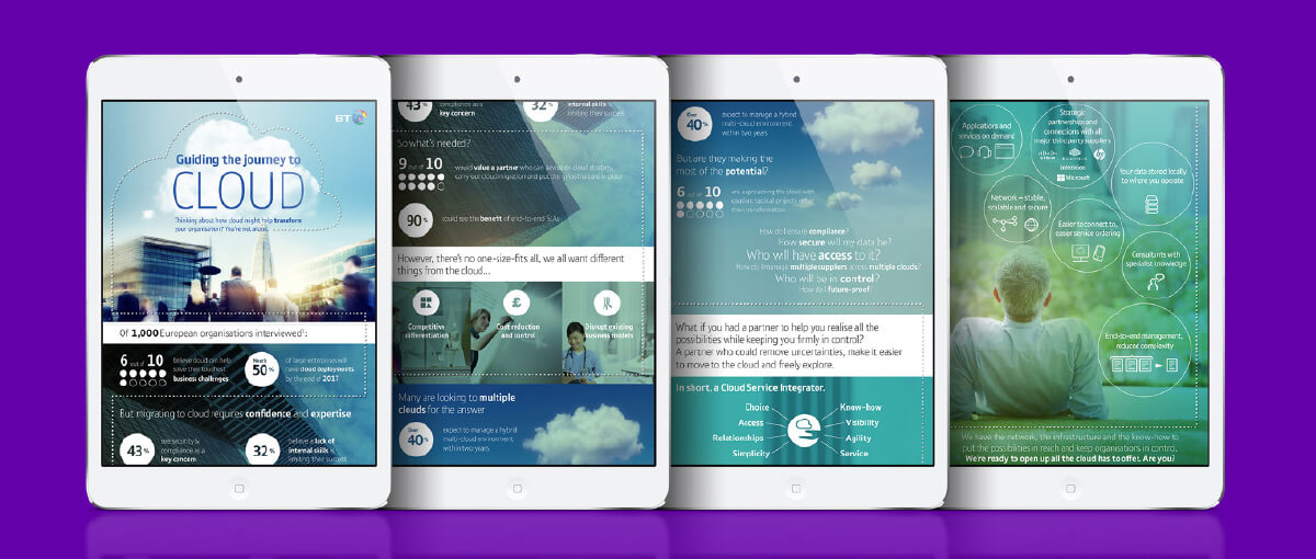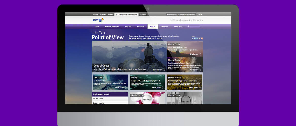 JPC created a stand-out programme to raise BT’s profile in hot topic areas such as Cloud of Clouds, IoT and Security. Our Let’s Talk Point of View hub worked within the constraints of the existing BT GS website, aggregating BT’s best thought leadership and aligning it under an original focus. We also co-created a series of white papers, infographics, fast-facts and opinion-led content to appeal to a varied audience base, channels and formats.