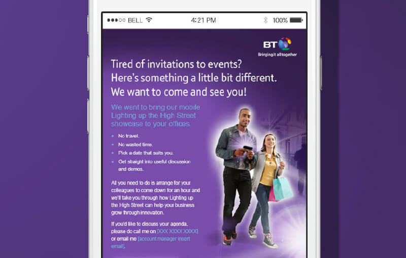 Our challenger partnership kept growing as JPC helped BT take their new Retail proposition to market. Combining BT Global Services and BT Expedite, our Lighting Up the High Street campaign offered retailers an exciting new set of outcome-led solutions and pioneered a new transformational proposition led sales and marketing programme for BT, which won silver for B2B Marketing Awards Best Live Event.