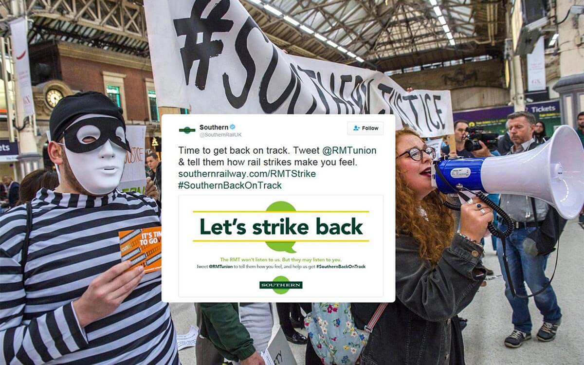 Other more creative initiatives have also been doing the social media rounds, with customers taking ownership of Southern’s own campaigns and tailoring the messages to the realities of their customer experience. One of the most popular social trends is the ‘Southernfail’ app, which responds to a recent campaign introducing passengers to the people behind the Southern brand. The original poster campaign, featured on all Southern trains, shared simple, human stories about individual staff members. An effective, and very authentic campaign – until tricky scenes and customer complaints tested Southern’s authenticity, and exposed its failings. Not only were customers left disgruntled, but (if you cast your mind back 6 months ago) one of Southern’s first public responses to the strikes, instead of taking ownership and seizing the opportunity to turn negativity into a positive was to shift the blame and steer raging customers towards the RMT Union. “Let’s Strike Back” was the rallying cry of their Metro takeover, urging customers to tweet @RMTunion and share their grievances. So much for the human, personal approach then.