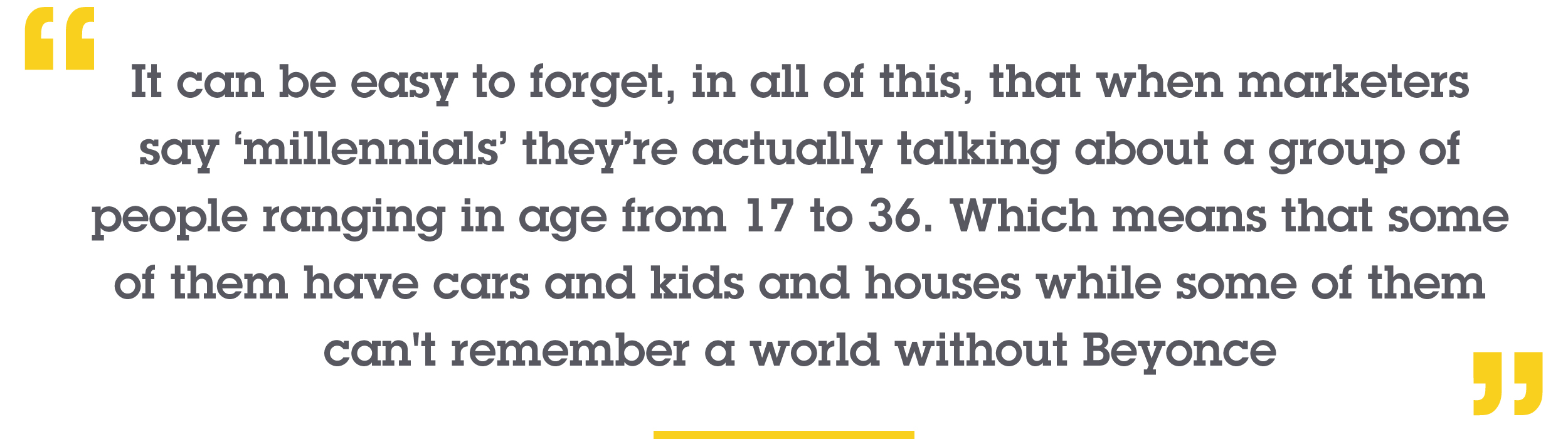 It can be easy to forget, in all of this, that when marketers say “millennials” they’re actually talking about a group of people ranging in age from 17 to 36. Which means that some of them have cars and kids and houses while some of them can’t remember a world without Beyonce. The possible variations within such a large group are staggering.