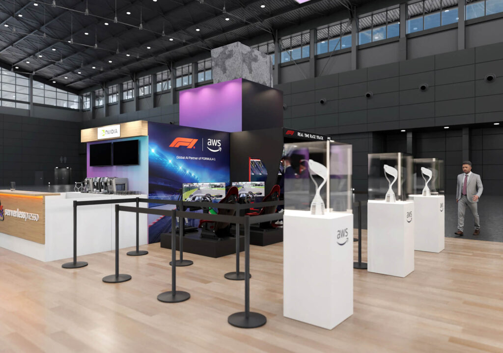 NVIDIA’s branding and the F1 installation were woven into the space without diluting brand clarity. Strategic lighting and framing helped these experiences shine – within the AWS narrative, not outside it.