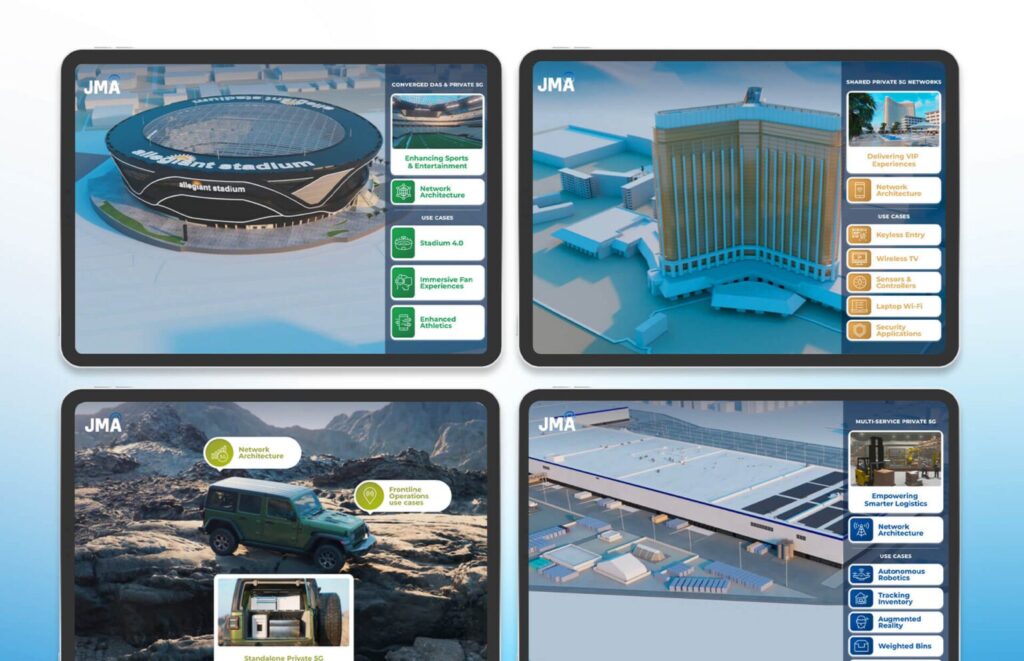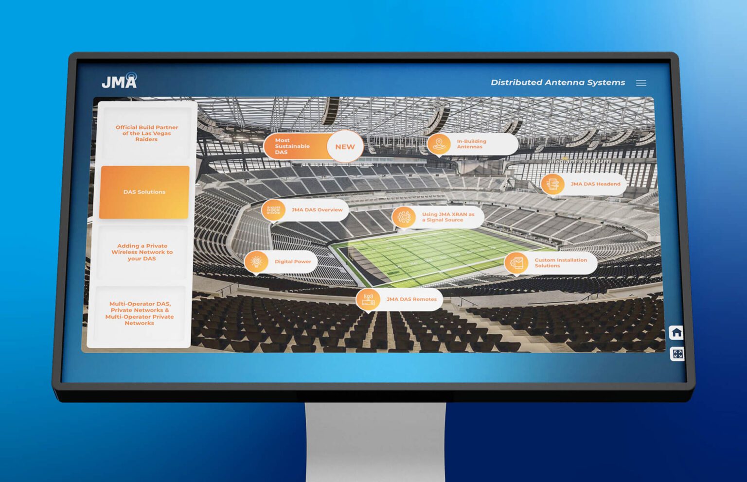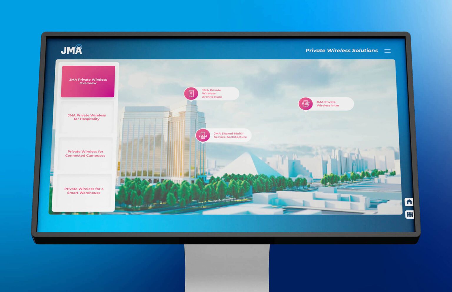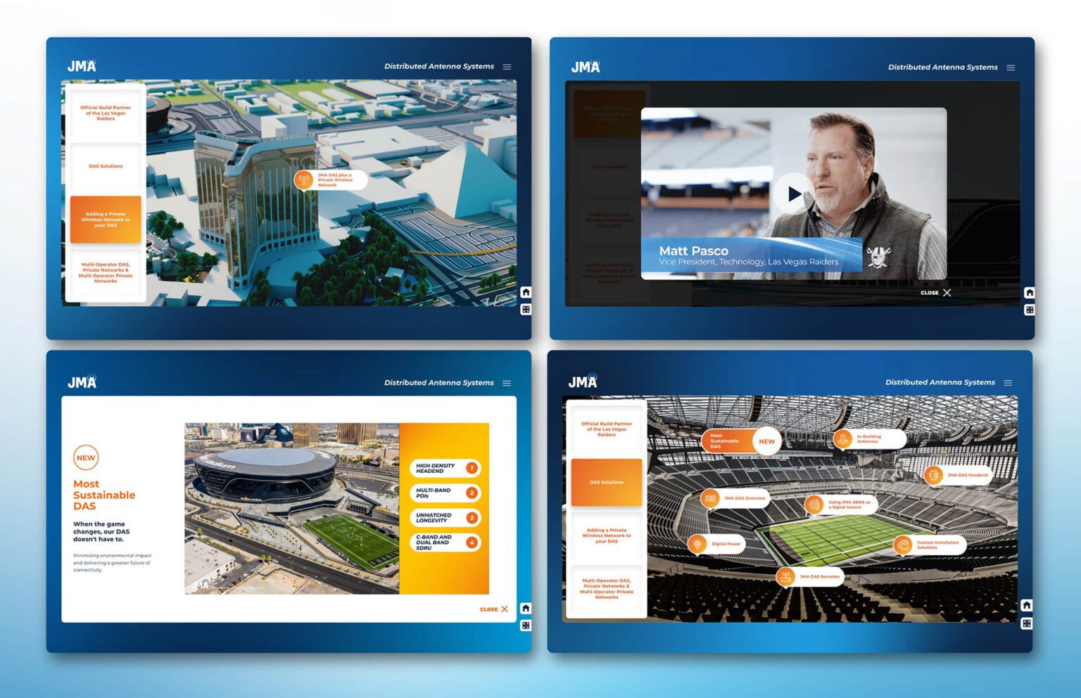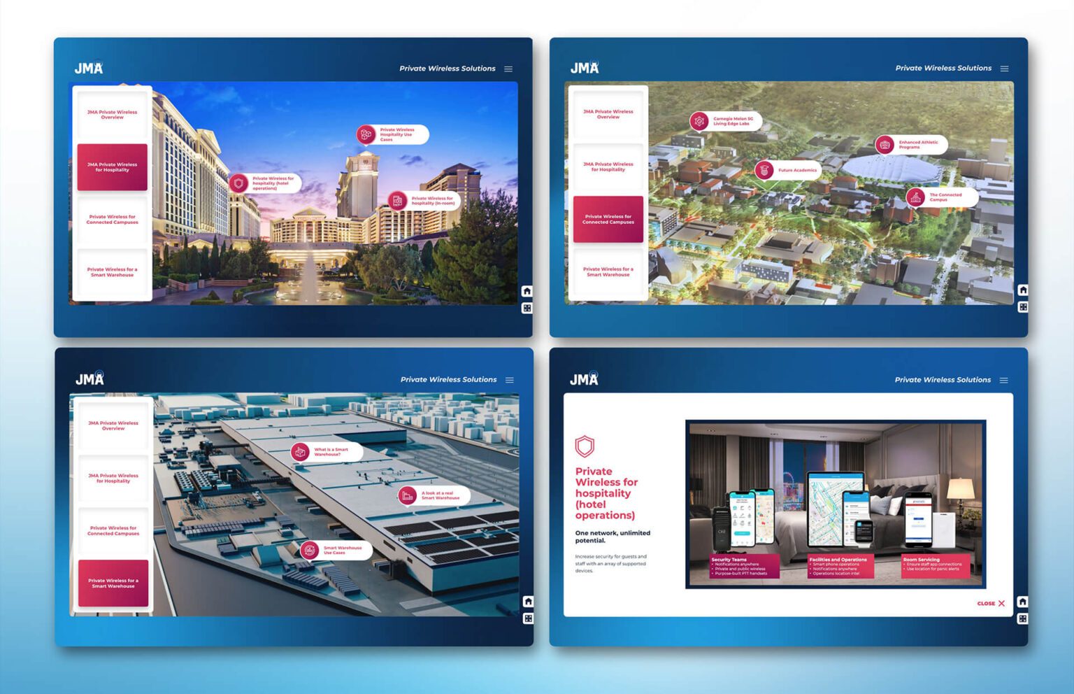After a high impact vision video as introduction, users are served four key propositions, visually tied to a 3D map of iconic Las Vegas – including a hotel, military base, cell tower and football stadium to deliver an engaging end-to-end story. JPC then created immersive 3D flythroughs to allow users to intuitively guide their unique story via sub navigation and access key information or video content leveraging PowerPoint as a base – which can also be used offline by sales. The flexible platform can also be accessed on touchscreen and iPad via a stand-alone app or the JMA website, making it versatile and ideal for events.