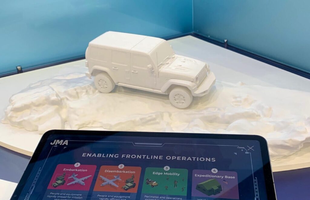 Alongside the interactive tool, we also designed and built an interactive AR experience to bring their key use cases to life. This experience consisted of 4 incredibly detailed 3D printed models – mirroring the stadium and hotel from the platform, as well as a jeep showcasing 5G edge capabilities, and a smart logistics warehouse.